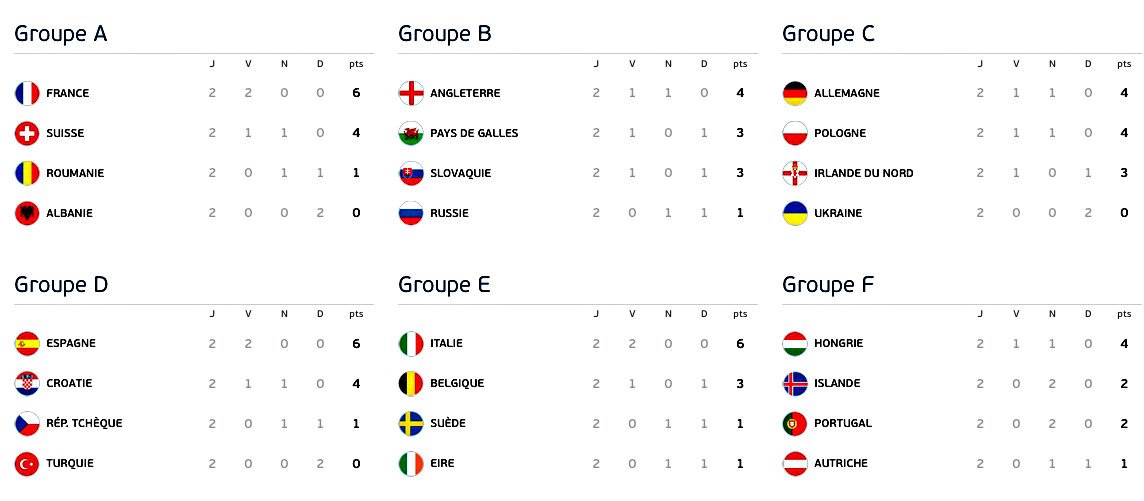 | Прогнози | Результати ігрового дня: Чемпионат Европы 2016 : 3 тур Чемпионат Европы 2016 : 2 тур <= попередній Ігровий день (Турнір) (Matches: 12) => Наступний Ігровий день: Чемпионат Европы 2016 : 1/8 фіналу | |||||||||||||||