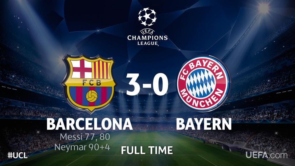| AAA : (07/05/2015 01:31) ЛЧ 14/15. Плей-офф : 1/2 финала,первые матчи | А барса у баваріі лише з розромними рахунками аиграє то 4:0 то 3:0, а частіше всеж таки програвала аж 5 раз... Результат не дивний за такоі кількості травмованих у баваріі а от гра сподобалась - якби не мессі то була б нічия